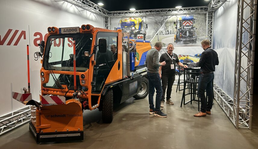 Indoors, the Ladog E1250 was presented, equipped with the Schmidt eSyntos spreader and a compact VPL plow on a QM-0 plate. This fully electric winter service combination shows that zero-emission winter maintenance is already available today.