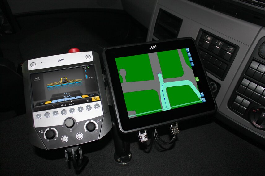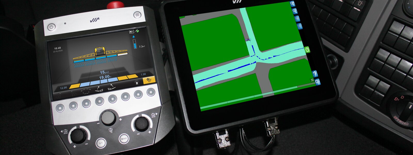 The guidance system provides precise and real-time information about treated and untreated surfaces. The colour display shows the exact position of the machine on a map. A clear LED bar gives the driving instructions, which are calculated based on the driving speed and GPS signals. The treated and overlapping areas are each displayed in a different colour. In this way, the system supports efficient and safe comprehensive de-icing.