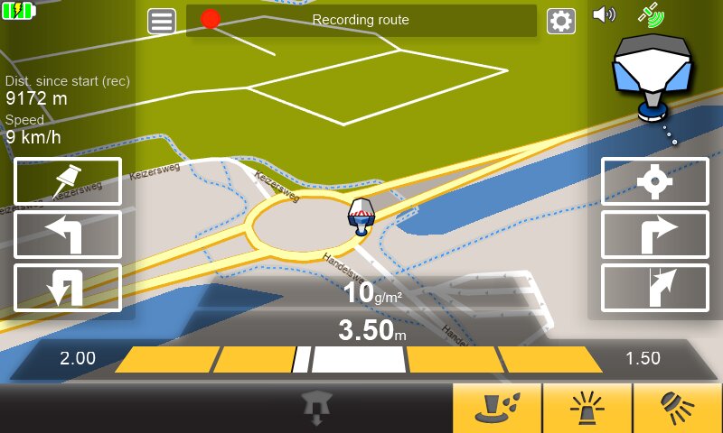 The system recognises if the vehicle deviates from the route. The driver is alerted with an audible and visible signal. The current spreader settings are retained, but the driver can adjust them if necessary. When the driver returns to the route, Route Assistant resumes route guidance and automatic spreader settings.