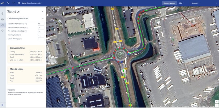 Once a route has been recorded using the Route Assistant the route can be edited using the Route Manager module on the web-based IntelliOPS data platform. The recorded route can be retrieved from the control panel using a USB stick or 'over the air'. Both navigation points (driver instructions) and change points (machine parameters) can be added or changed. It is also possible to add your own voice instructions. By using the online Route Manager module, routes and spreader settings can be changed without having to drive the route again.