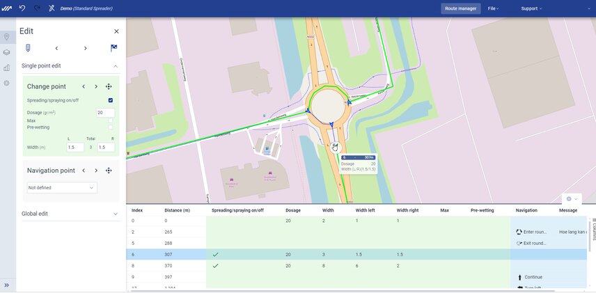 Mit dem Modul Routenmanager können Routen erstellt und geändert werden. Eine Route kann auch spezifische Streuparameter wie Breite und Dosierung enthalten. Routen können mit unseren Fahrzeugen aufgezeichnet werden oder neue Routen können komplett online per Drag & Drop erstellt werden, was Zeit spart und den CO2-Ausstoss reduziert. Wenn Ihr Fahrzeug mit dem Internet verbunden ist, können Ihre Routen per Funk an das Bedienpult im Fahrzeug gesendet werden. Mit der Fahrer-Feedback-Funktion kann der Fahrer ein Feedback zur Route und/oder zur Situation während seiner Fahrt geben. Dieses Feedback wird sofort in IntelliOPS für den Koordinator sichtbar. Wenn Sie den Routenassistenten erworben haben, werden die Streuparameter automatisch an das Bedienfeld übertragen.