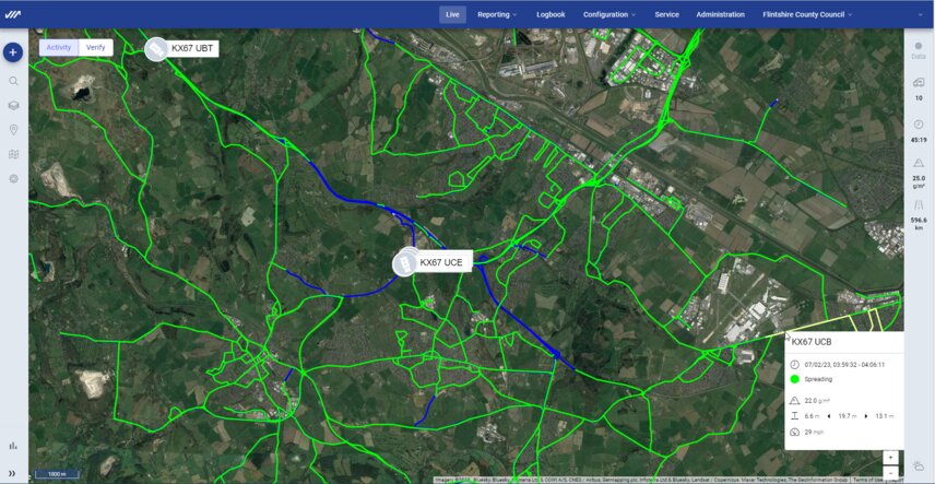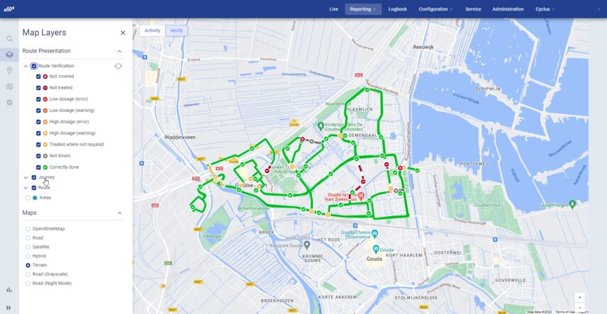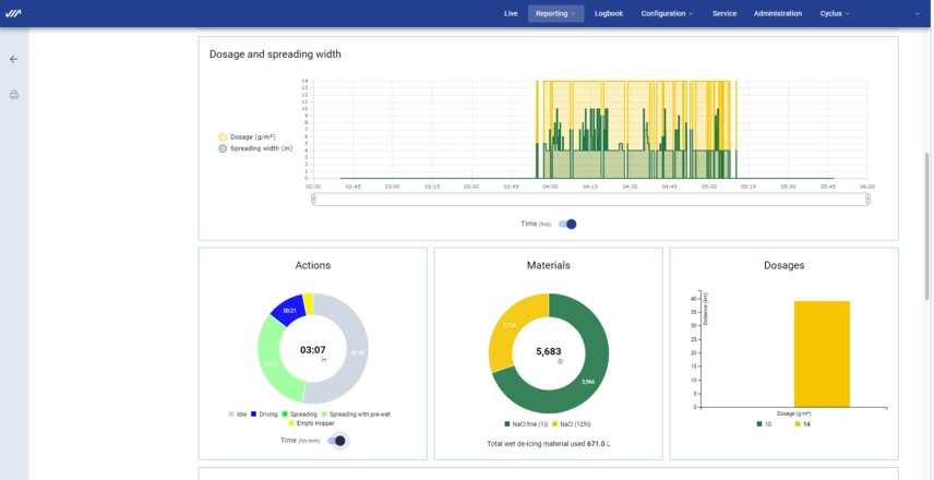 Das Modul Monitoring gibt Ihnen einen schnellen Echtzeit-Einblick in die Aktivitäten und den Status Ihrer Fahrzeuge auf anpassbaren Karten mit mehreren vordefinierten Layouts, anpassbaren Filtern und persönlichen Einstellungen. Sie können sofort sehen, welche Fahrzeuge im Einsatz sind, ob sie fahren, streuen oder sprühen, wann sie gestartet sind, wie lange sie fahren, wie schnell sie arbeiten und wann sie zum Depot zurückgekehrt sind. Darüber hinaus können Sie den Bestand an verbrauchten Materialien in Echtzeit einsehen und Warnmeldungen für kritische Werte festlegen.