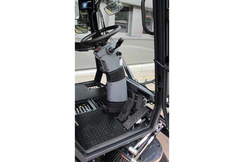 Die geräumige Kabine ist mit einer hochwertigen Geräusch- und Vibrationsdämmung (72 dB(A)) ausgerüstet. Die bis zum Boden durchgezogene Frontscheibe und die Sichtscheibe im Fahrerhausboden bieten optimale Sicht auf Kehreinheit und Saugmund. Die exzellente Rundumsicht trägt zu einer angenehmen Arbeitsatmosphäre bei und unterstützt somit den sicheren Betrieb im Strassenverkehr.