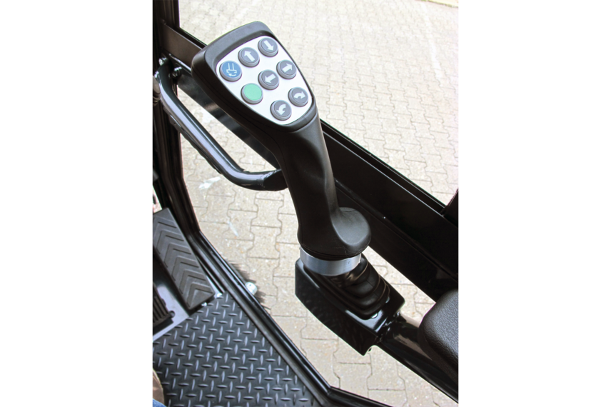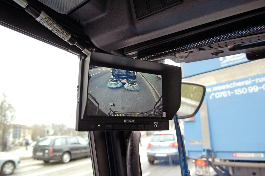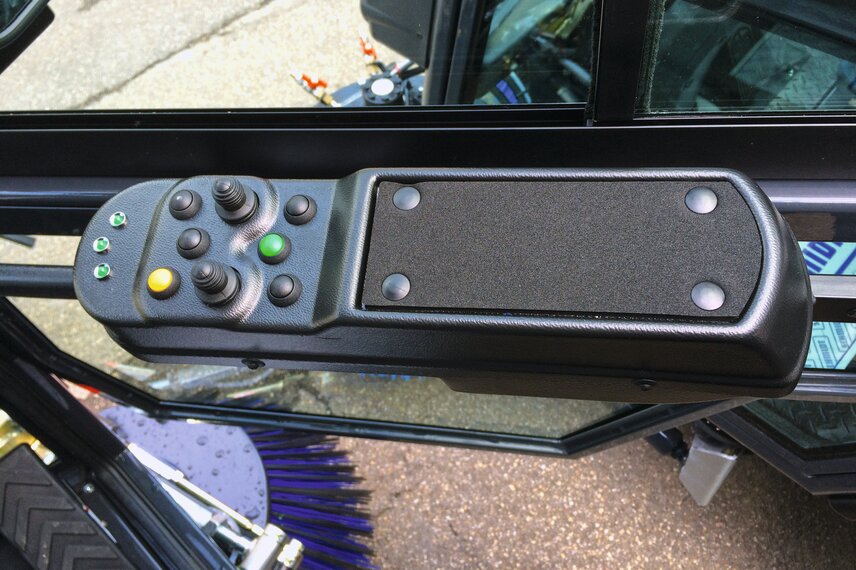 Die Kehreinheit wird über die Türbedienkonsole mit Joysticks und Drucktasten gesteuert. Mit der Auto-Drive Option können über den ergonomisch geformten multifunktionalen Fahrhebel alle Kehrfunktionen sowie die Fahrbefehle im Kehrmodus bequem bedient werden. Fahren und Kehren aus einer Hand bedeutet auch mehr Sicherheit und weniger Stress. Die wichtigsten Informationen sind auf einen Blick auf dem Farbdisplay in der Dachkonsole sichtbar. Zusätzlich kann ein Mechaniker im Display maschinenspezifische Einstellungen vornehmen. Mithilfe des Onboard-Diagnose-Systems sind eventuelle Störungen schnell und effizient zu lokalisieren.