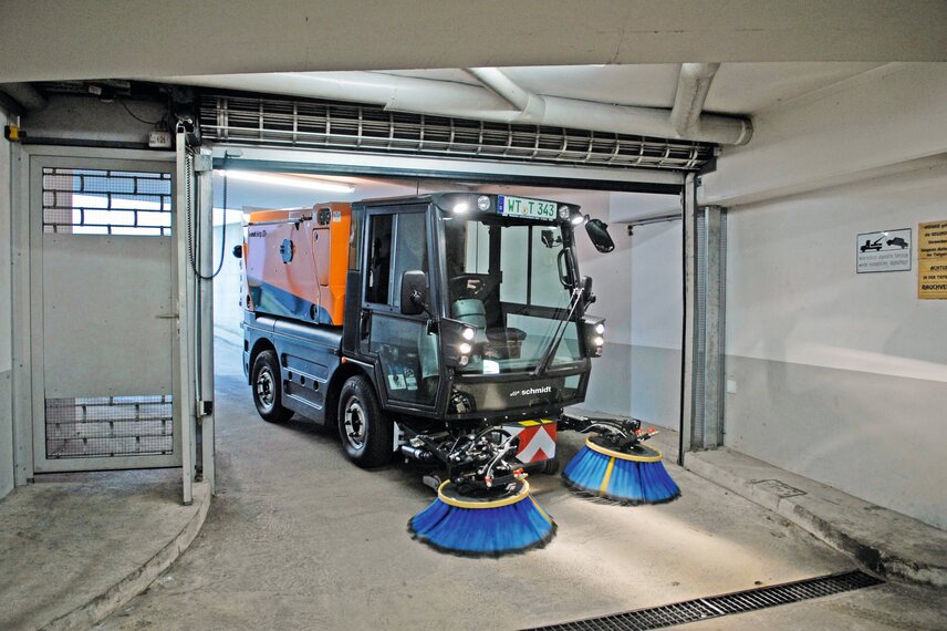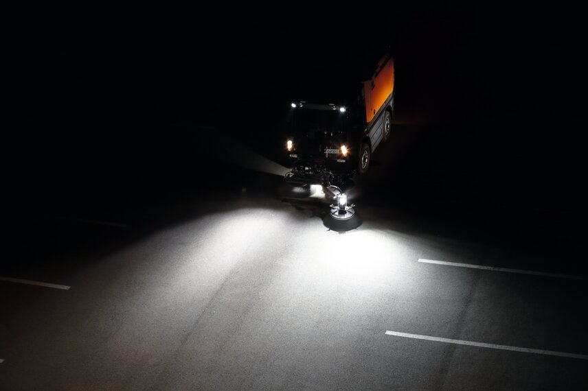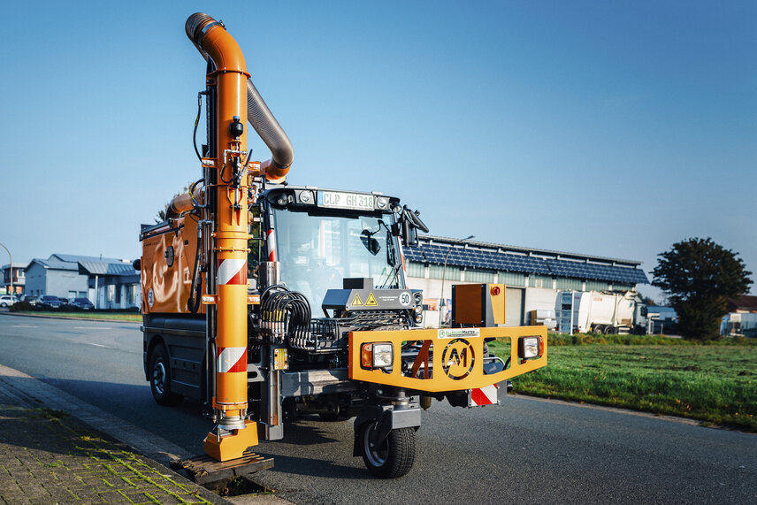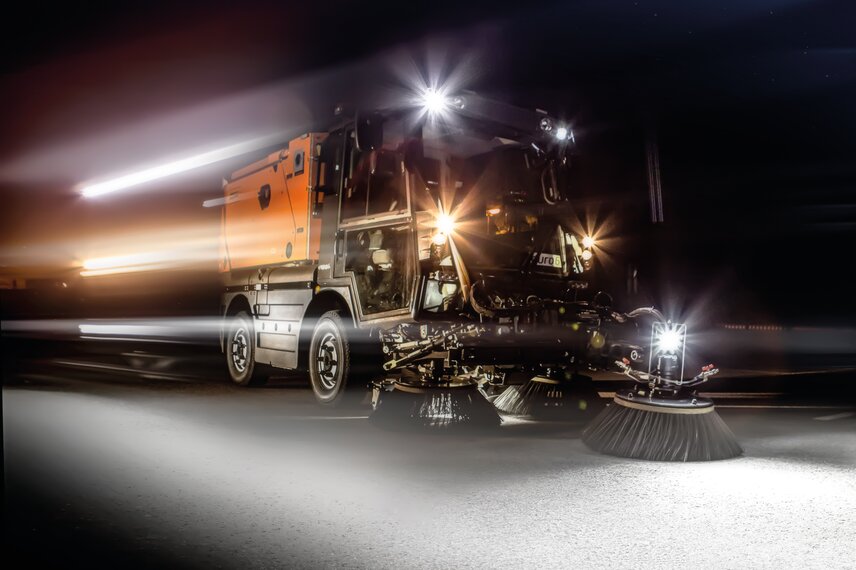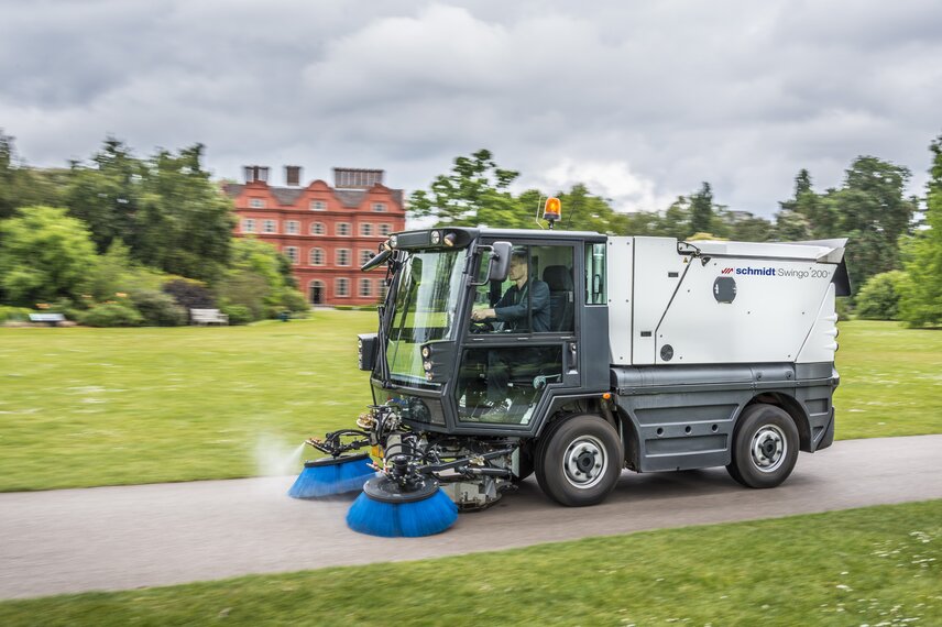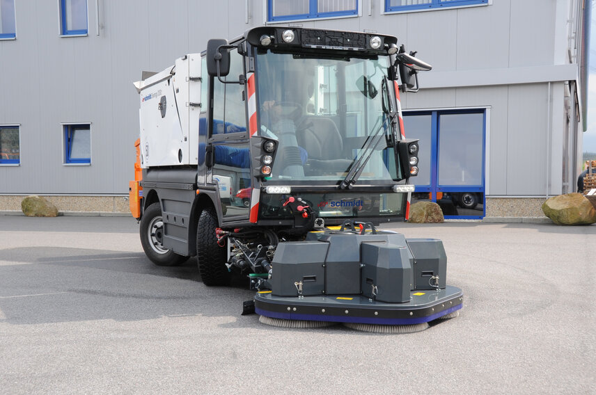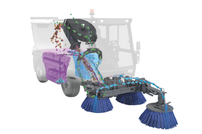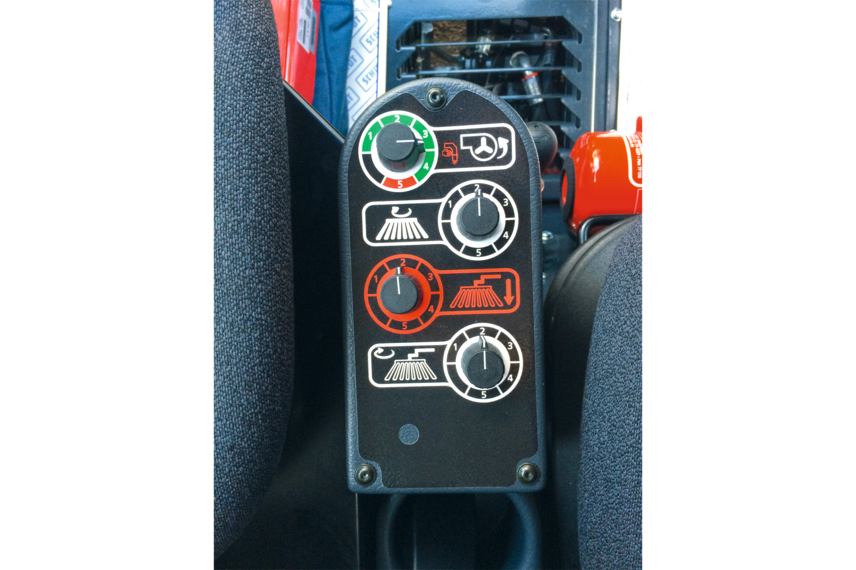 Das 3-Besensystem mit frei bewegbarem Frontbesenarm bietet umfangreiche Möglichkeiten und eine Kehrbreite bis 2.600 mm. Links-Rechts-Ausrichtung des Frontbesens ist genauso möglich wie Kehren auf zwei Ebenen oder schwerer Wildkrautbeseneinsatz. Alle Funktionen des Frontbesens werden hydraulisch gesteuert inkl. des Besenauflagedrucks. Die Beseneinheit unter der Kabine sorgt für eine optimale Zuführung des Kehrguts zum Saugschacht, eine Überdeckung ist immer gewährleistet. Optional lassen sich auch die Seitenbesen hydraulisch ausfahren und in der Neigung verstellen. Hierdurch wird eine noch bessere Anpassung an die Bodenbeschaffenheit im Kehreinsatz erreicht.