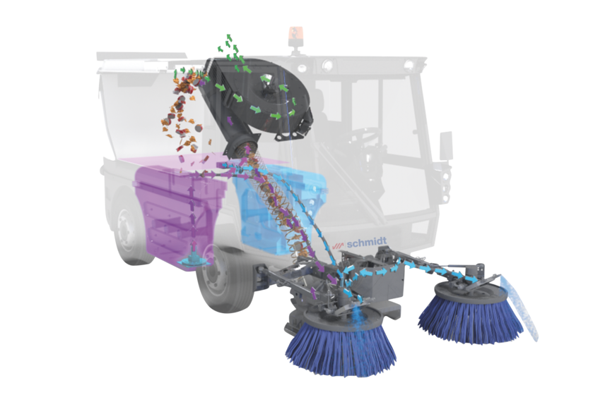 Für das 3-Besensystem gibt es einen luftströmungsoptimierten Saugschacht, der ohne separate Grobschmutzklappe auskommt. Nur durch Ankippen des Saugschachtes ist die Aufnahme von grobem Kehrgut problemlos möglich.