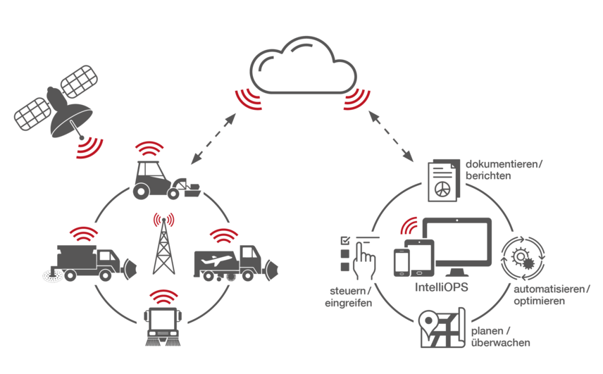 Darüber hinaus steigern vernetzte Flotten die betriebliche Effizienz. Durch die Möglichkeit, Daten zu sammeln und zu analysieren, können datengestützte Entscheidungen getroffen werden, um die Kehr- oder Streueinsätze zu optimieren und Kosten zu senken. Zum Beispiel durch die Optimierung von Routen zur Senkung des Kraftstoffverbrauchs oder zur Einsparung von Salz.