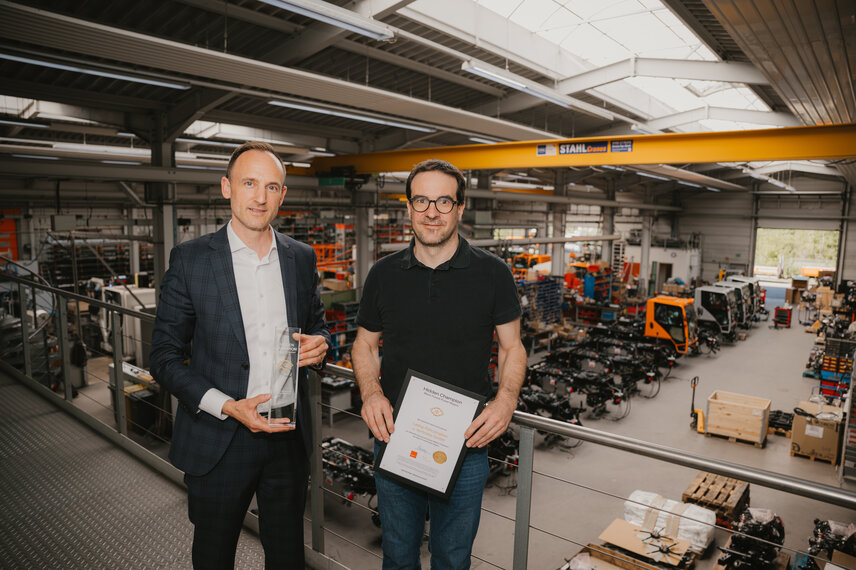 Der CEO von Ladog, Björn Guggenbühler (rechts), nimmt im Werk von LADOG in Zell am Harmersbach die Auszeichnung vom CEO der Wirtschaftsförderungsgesellschaft Dominik Fehringer (links) entgegen.
