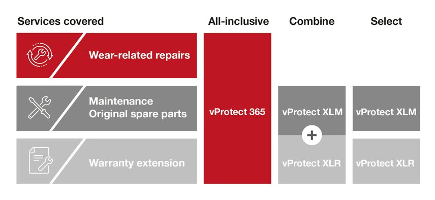 Als Arbeitsmittel sind Ihre Maschinen fast rund um die Uhr im Einsatz. Reparaturen sind daher unvermeidlich. Mit dem vProtect 365-Vertrag sind Sie abgesichert: Jede Reparatur, die nicht durch unsachgemäßen Gebrauch verursacht wird, ist in Ihrem Paket* enthalten.
