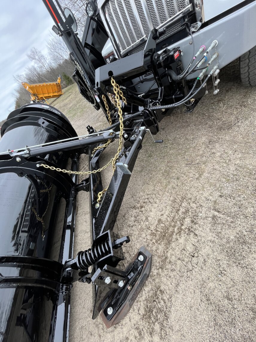 The greasable articulated frame is equipped with a 4 in. double action cylinder. dia. with a 2in shank. dia. nitrided intended for lifting the snow plough and coupling. The mounting plates are profiled and integrated into the female part to support the two 4 in. tubular crosspieces. x 4 in. x ½ in. which connect the column to the frontal harness. The upper part of the articulated frame is equipped with a greasable pivot and three (3) integrated grapples allowing the easy attachment and adjustment of the snow plough lifting chains. The front column for operating the front slide of the side wing system is made of a 6-5/8 in. joist. x 3-7/8 in. in the shape of a C profile in which the ½ in. slide plate is inserted. The column is coupled in such a way as to allow the hood to be opened at any time, without requiring hydraulic force. The assembly of the front column must provide for the free floating of the side wing over a stroke of at least 10 in. in height.