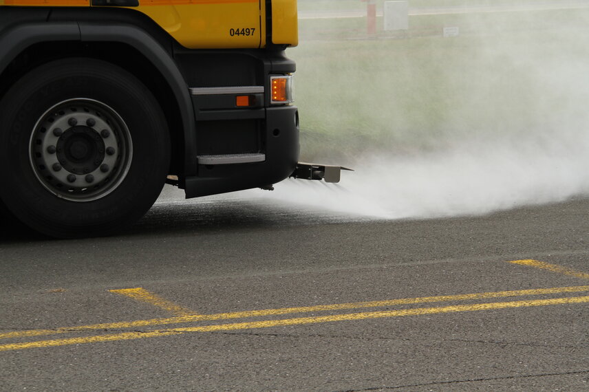 By applying a detergent and water mixture, the Schmidt ASC 990 also cleans aircraft stands. The soiled area is damped with the cleaning emulsion using the additional spray bar in front of the disc brushes. The surface is then treated and roughened with the disc brushes. The loosened material is collected in the hopper via the rear suction unit. This version is particularly suitable for intensive cleaning of traffic areas.