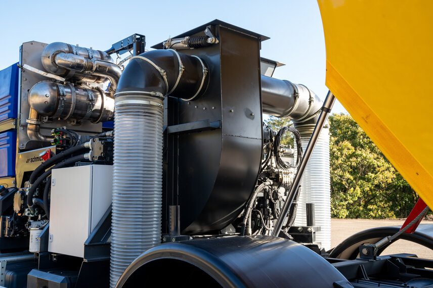 The power of the high-performance suction fan can optimally be adapted to the amount of dirt. A speed sensor is built into the hydraulic, which monitors the speed / performance of the suction fan. Stepless adjustment is also possible. The speed is controlled hydraulically and can be adjusted via the control panel. The high-performance suction fan supplies the lateral blast nozzles with air flow as well as the rear suction unit and the optional wander hose with suction air. Compared to a conventional V-belt or toothed belt drive, the suction blower requires no maintenance. The impeller and the housing are made of high-wear-resistant metal.