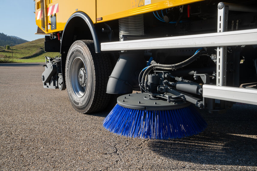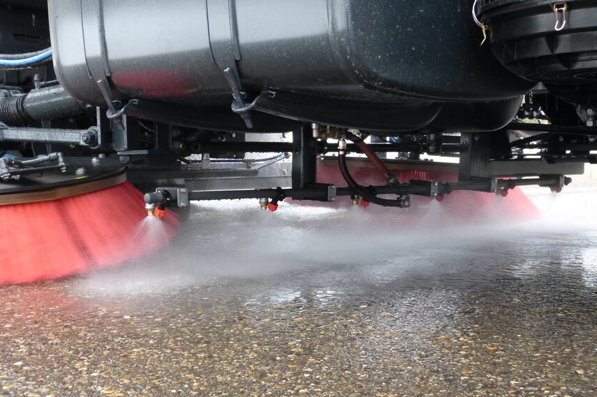 The two optional disc brushes enable an increase in sweeping width and a more comprehensive cleaning. Both ground contact pressure as well as swivelling pressure can be pneumatically adjusted and optimally adapted to the specific operating conditions. The integrated water spray nozzles ensure effective dust control, guaranteeing safe and clean working conditions.