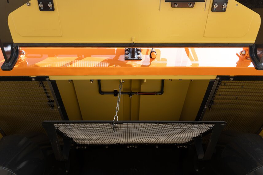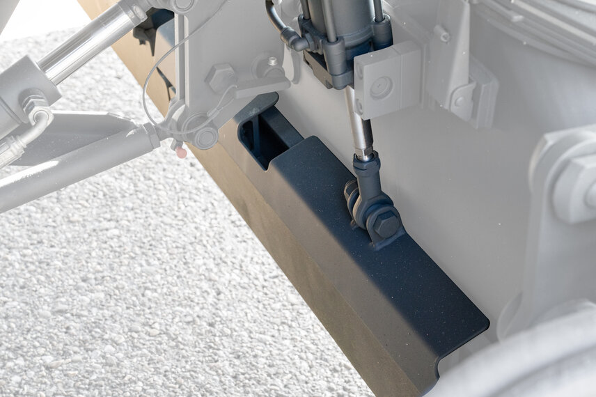 The rear suction unit has two suction ducts (width: 2 x 1,150 mm), which are airflow-optimised and coated on the inside with a hot-vulcanised wear protection as a standard. This ensures less friction and less wear. The rear suction unit has a symmetrical weight distribution for optimised sweeping results. The sweeping pattern can also be adjusted continuously from the outside and features a wear indicator with colour scale.