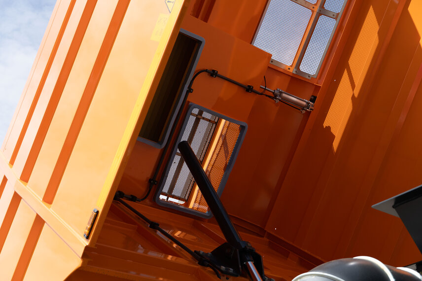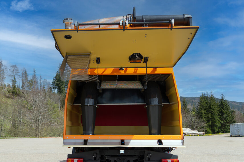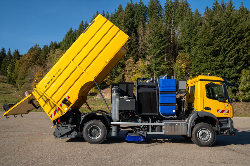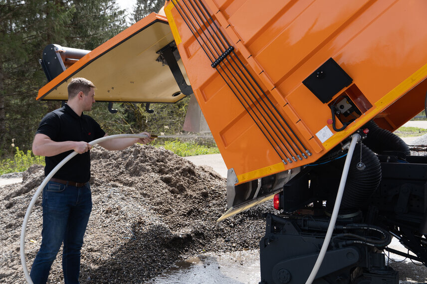The generously dimensioned hopper has a capacity of 9.5 m³ and is equipped for large quantities of debris. As standard, the hopper floor is made of stainless steel. The hopper can be tilted hydraulically and offers safe emptying thanks to the 52° tilting angle. The hopper can be tilted without starting the auxiliary engine and is operated via a separate remote control, which is stored in a watertight storage box.