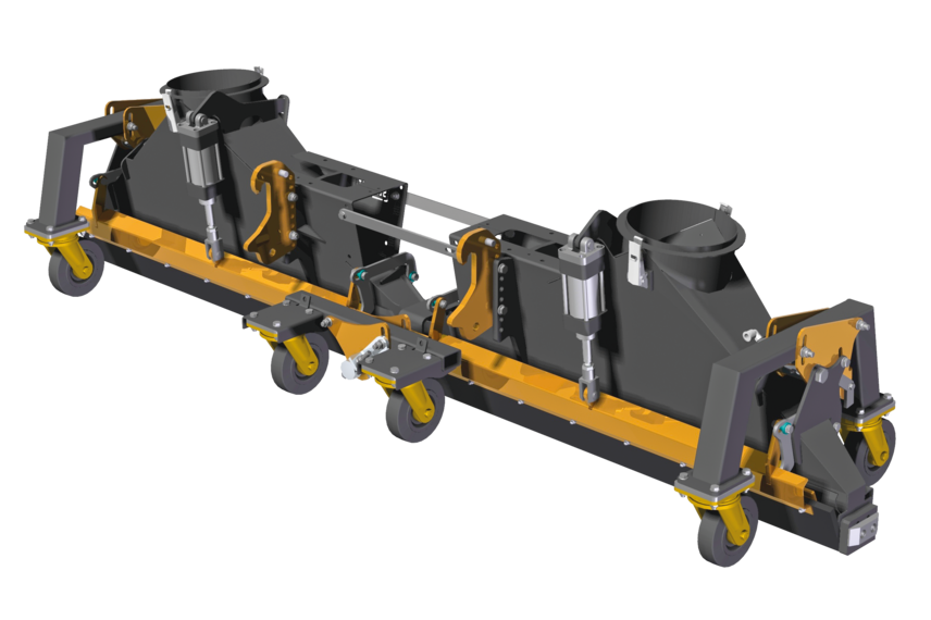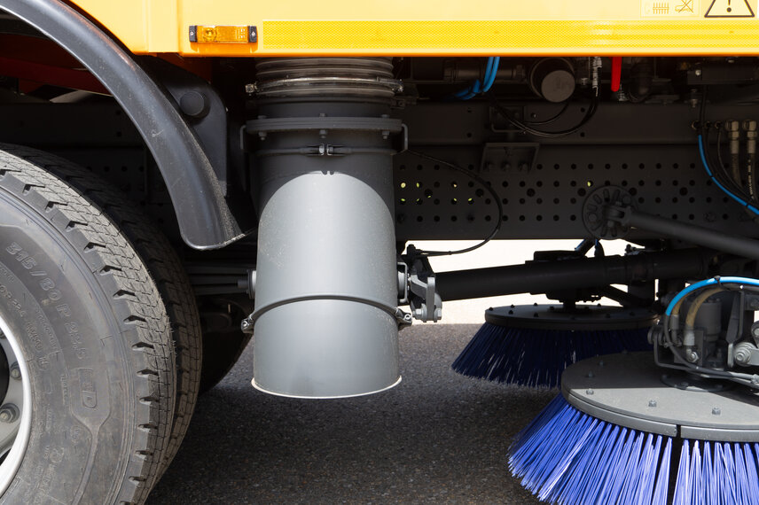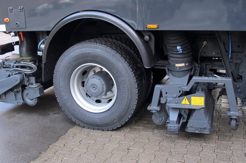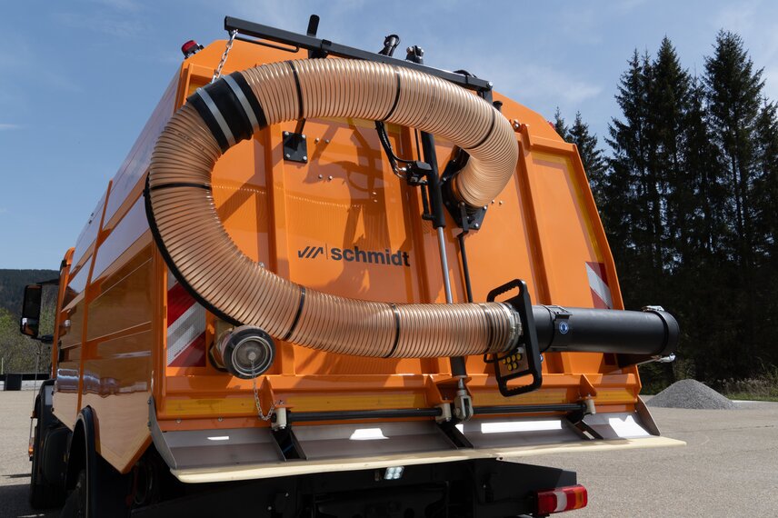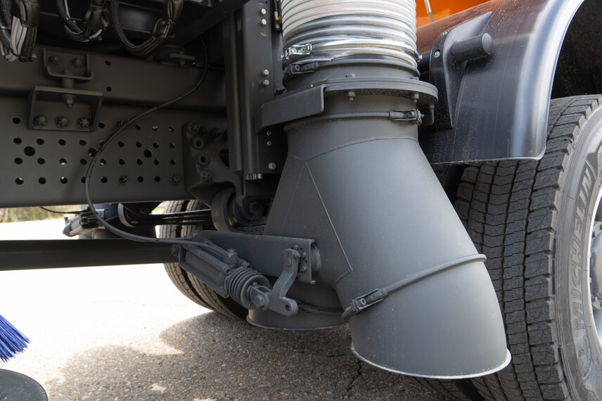 In addition to the suction units, two suction ducts can be fitted on the left and right in front of the rear axle. This increases the suction width by 500 mm in each case. The suction ducts are pneumatically operated and have a lateral adjustment range of 320 mm. Suction is possible when the suction duct is extended or retracted to the side. The integrated water spray nozzles also ensure optimum dust control.