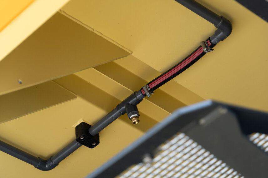This enables rough cleaning of the hopper or the sweeper after emptying. The water hose is 10 metres long and has an adjustable water spray nozzle. Water is supplied via the hydraulically driven water pump. - Leaf screen cleaning unit in the hopper