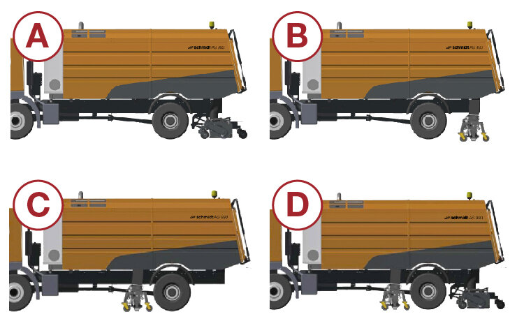 The rear suction unit (A) and the liquid suction unit (B) can be installed individually at the rear, whereby the liquid suction unit can also be installed between the axles individually (C) or in combination (D) with the rear suction unit. The suction units are attached via a flexible lifting device that is independent of the chassis. This enables optimum ground adaptation during operation. The running wheels with integrated return mechanism guide the suction units reliably over the road surface. The optional quick-change system from Aebi Schmidt allows the rear suction unit to be exchanged for the liquid suction unit without tools in just a few minutes (A+B).