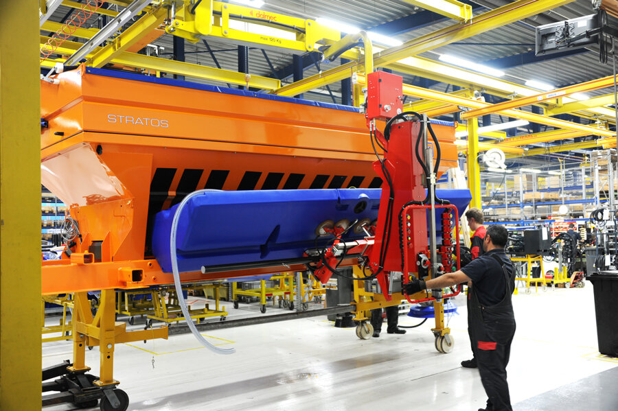 Shortly before the winter season, the production of spreaders such as Stratos, Syntos & Co. is running at full speed here. After the steel parts are delivered, the basic frame of the Stratos spreaders, for example, is manufactured in the in-house welding shop. This is followed by surface treatment and powder coating before assembly. Here they take care of the inner workings of the spreaders, assemble electronics, install software and, depending on the customer's wishes, attach dampening salt tanks. Before delivery, each spreader is subjected to a precise test before it is finally sent on its journey to the customer - usually within 3 days of completion.