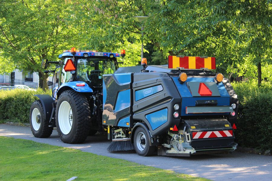 The Schmidt Wasa 300+ is a powerful towed sweeper machine with a very high level of throughput and high sweeping capacity even when there are large amounts of dirt and coarse debris. For around a year now, such a machine has been used in the Swedish city of Norrköping by Per Lack Entreprenad. Attached to a tractor, it is used there primarily for cleaning streets in industrial areas or for preparing asphalting works. Markus Kuntze, a driver who works for Per Lack Entreprenad, is extremely satisfied with the cleaning result and was already familiar with the machine from the previous version Wasa 300. “A crucial point for us is the large capacity of the hopper at 3 m3 and the outstanding sweeping result, even with heavily polluted road surfaces and debris such as grit, branches and even cans or other trash. Compared to the previous model, we were actually able to notice an improvement here,” says Markus Kuntze. In comparison to suction sweepers, the mechanical pick-up of the debris means that the Wasa 300+ does not produce any exhaust air from a fan – this is an advantage in particular in places where there is criticism of fine particulate matter blown from a fan. The Wasa 300+ covers a sweeping width of 2.4 m. Thanks to an adjustable roller brush cover with a retraction element, a newly developed roller brush prevents roller overthrow. This means that dirt cannot be ejected backwards, but rather is transported forwards to the elevator again.
