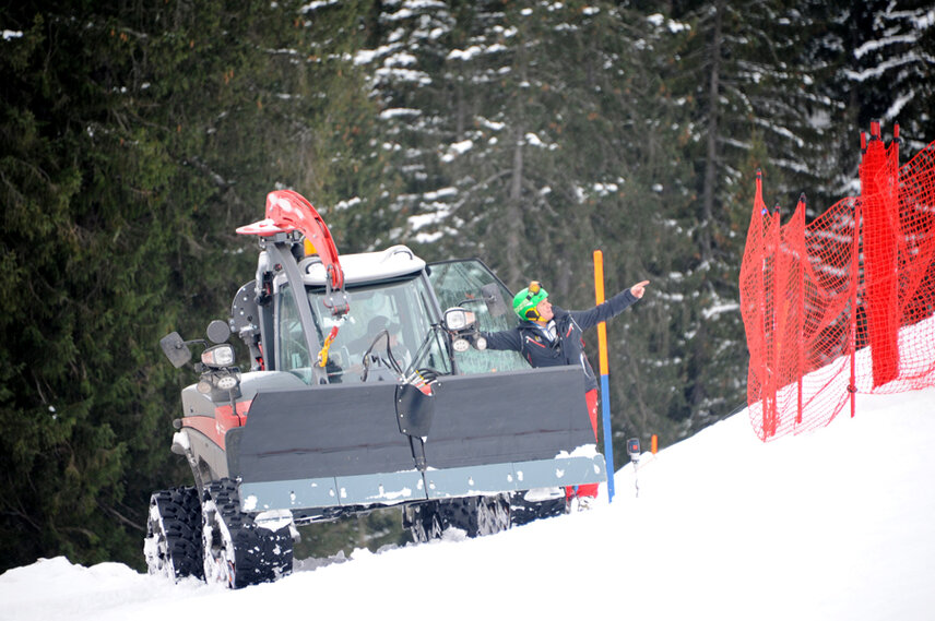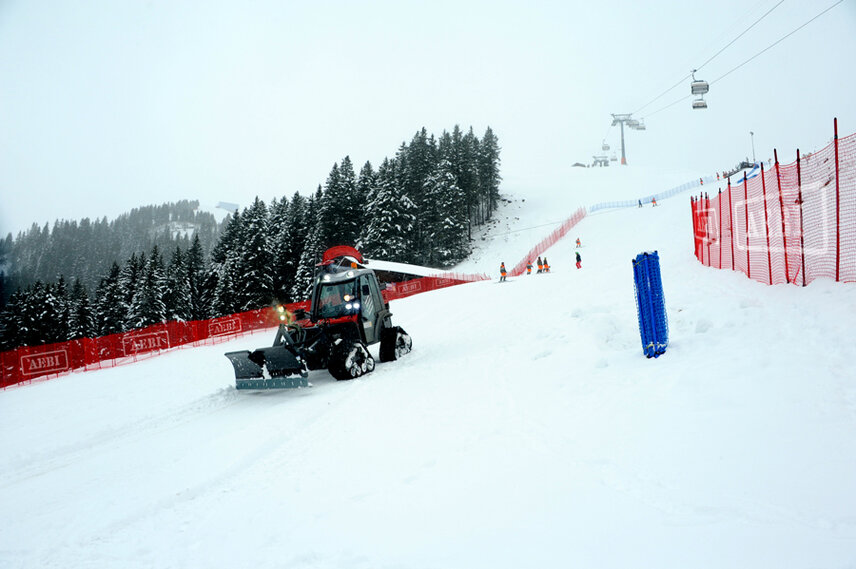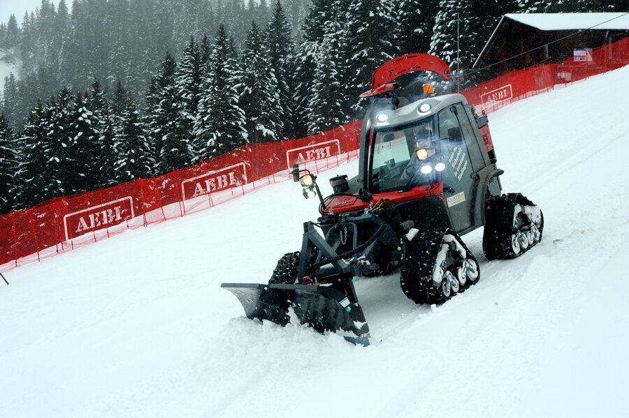 A ski slope is not just like another. Racing director Hans Pieren has highest demands for the quality of his World Cup slope. The slope has to be extremely hard and compact. And in the matter of fairness of the competition the slope condition has to stay the same from the first to the very last competitor. The influence of the condition of the racing slope on the driving behaviour is huge. The slope preparation is therefore a science in itself, which also contains complex irrigation. For the watering an injection bar is used. With this tool the slope is being iced at temperatures around the freezing point in order to create an optimal surface. However, if fresh snow should fall it has to be removed before the starting of the race. On Thursday, shortly before the beginning of this year’s World Cup from the 9th to 10th of January in Adelboden heavy snow began to fall. In the last minute, far more than 50 volunteers cleared the snow from the slope away to the edge with their ski. They were actively supported by the Aebi TT280, which is equipped with crawler tracks and an overhead winch. Its speciality: secured with the overhead winch even the steepest parts of the slope can be prepared. The specially developed winch contains 500 meters of working rope and operates with a traction force up to 4 tons. To secure the Terratrac, the rope can be attached to a tree or a cableway pole, for instance. The 360° rotatable swivel arm enables flexible working at the slope. And while the big and heavy snow groomer could damage the sensible surface of the slope and the extensive caterpillars could lead to irregularities by turning around, the Aebi TT280 can move around without any negative impacts on the slope thanks to rubber tracks and all-wheel steering. Equipped with a Schmidt VP wedge snowplough, the Terratrac can easily clear away the fresh snow from the slope just below the starting point. With a clearing width of 2.4 meters and the power of 109 PS the Aebi Terratrac is clearly preferable to manual clearing by hand or ski respectivly.