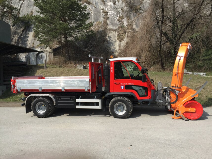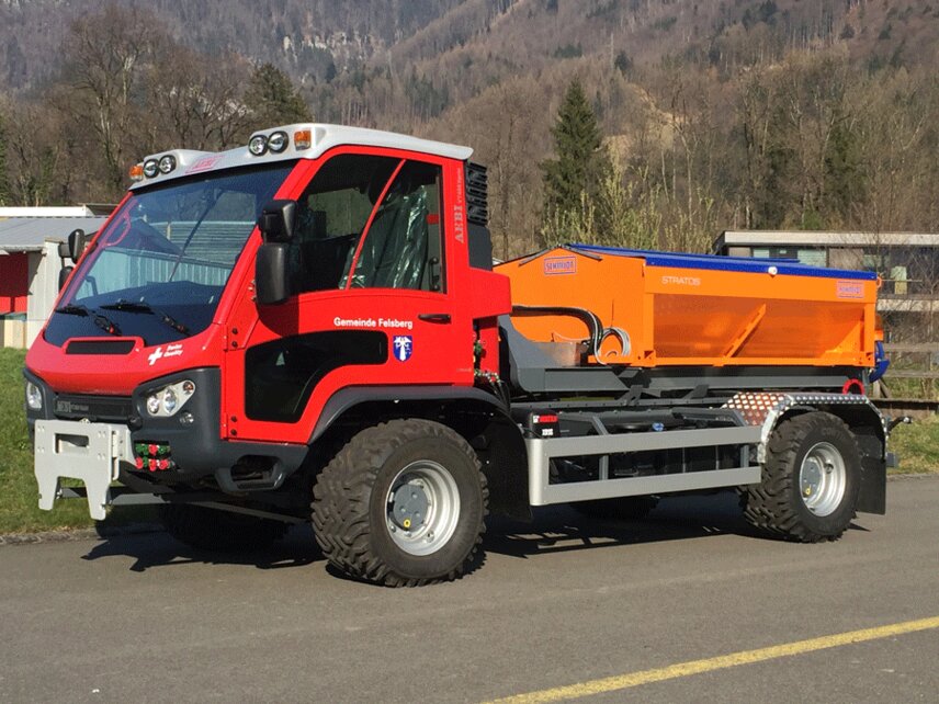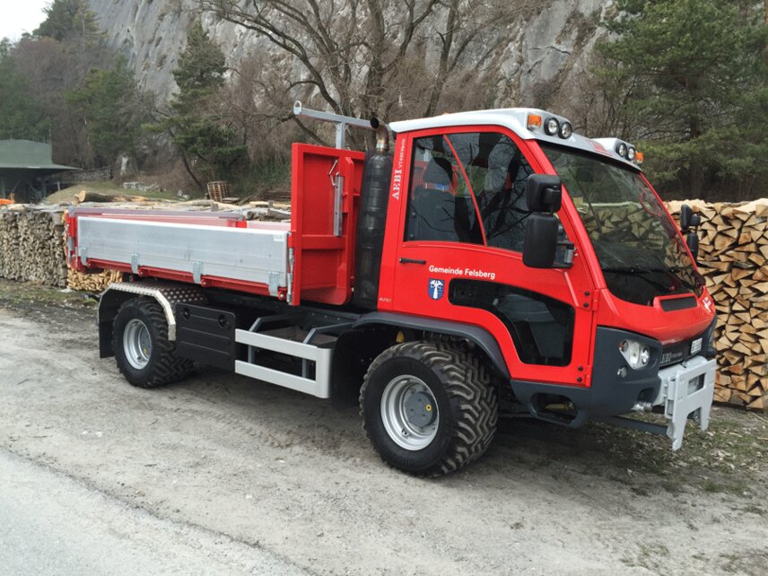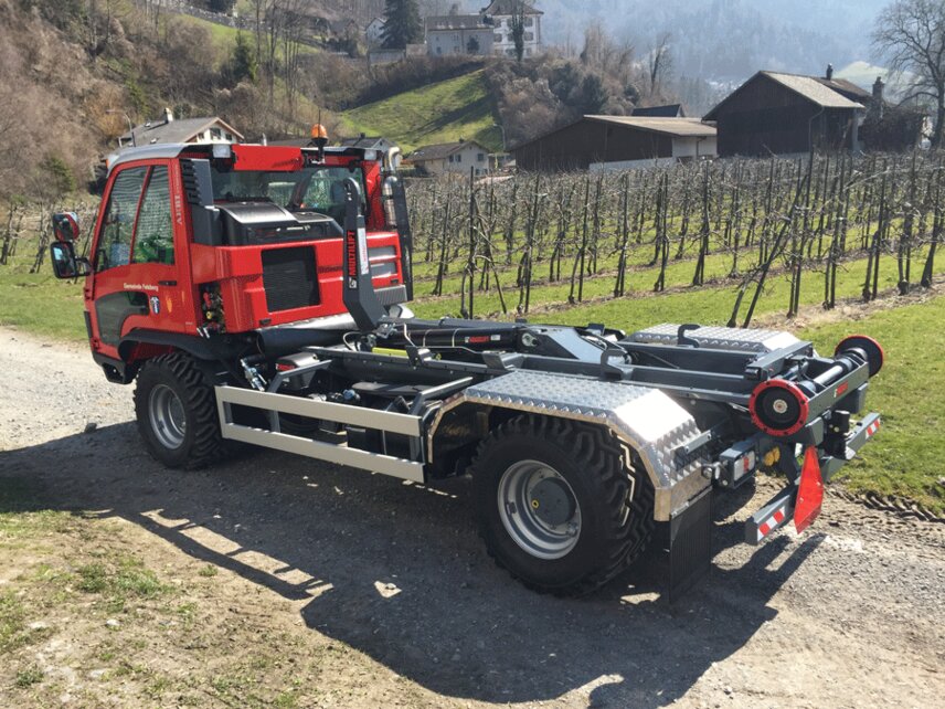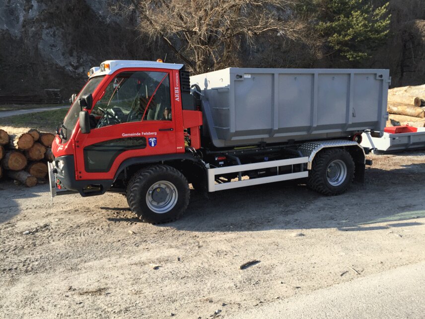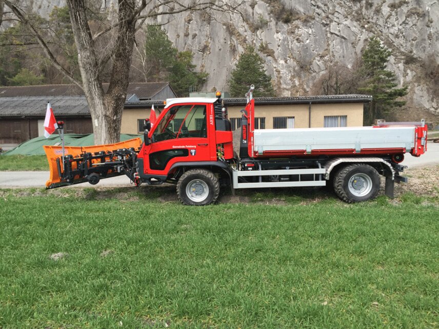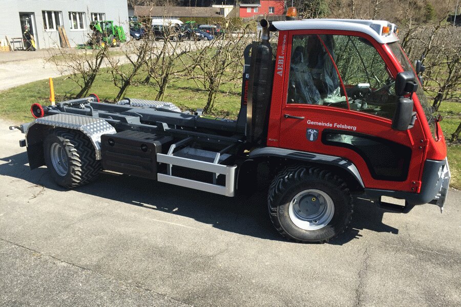 Since end of March an Aebi VT450 Vario Euro 6 is in use in the city of Felsberg in the Canton Grisons in Switzerland. Following the motto “7 in one swoop” the conversion artist provides real value in summer and winter maintenance. With a Hiab Multilift hooklift XR5S, tip lorry, various dumps or a container the transport of equipment like machines, equipment for construction sites, stones, wood or things like that becomes a breeze. Equipped with a Schmidt Tarron Compact MS 27 snowplough or a snow blower as well as a Schmidt Stratos wet salt spreaders F17-23, the new “colleague” in Felsberg is also in demand for winter maintenance and thus in service round the year.