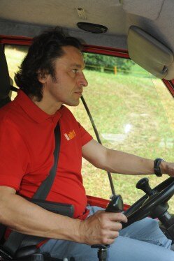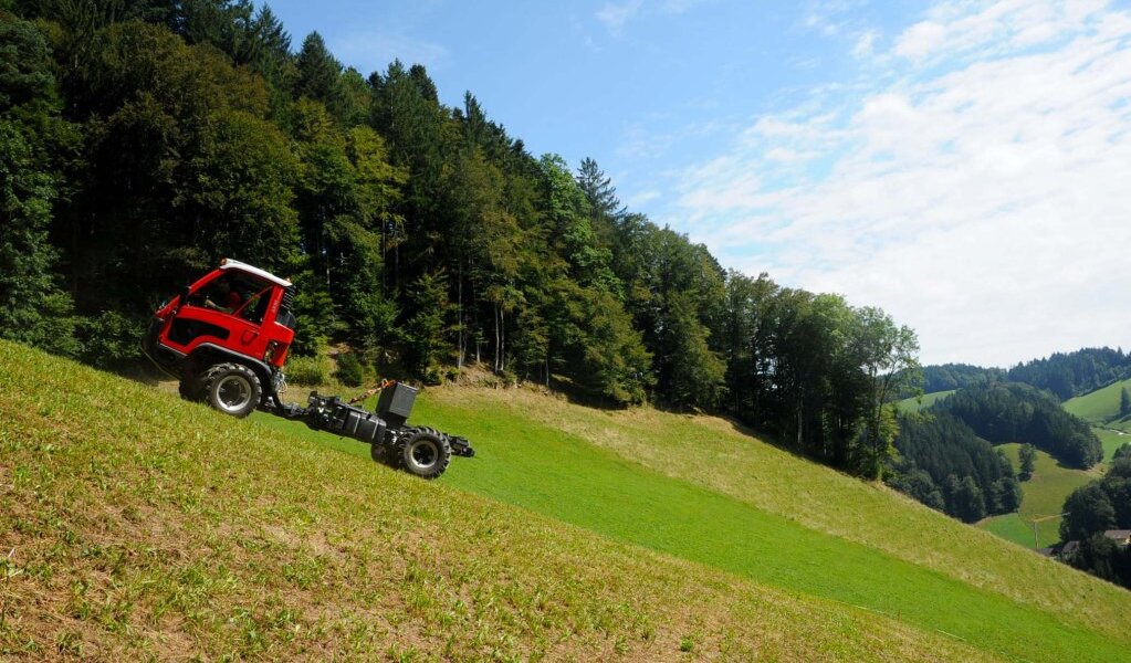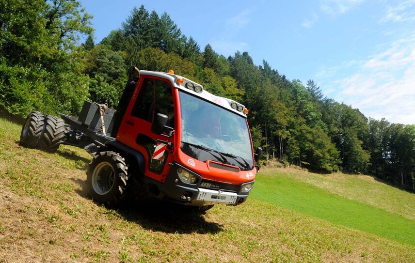 The terrain used for testing was the fields around Heinz Iseli’s farm in Biembach, around 10 minutes from the site of the Aebi factory in Burgdorf. Heinz Iseli is manager of the workshop at Aebi Schmidt Switzerland in Burgdorf and is also the 5th generation of his family to run a farm with 8 hectares of land and around 10 suckler cows. He not only knows every single detail about the Aebi vehicles but also knows how to maneuver them on extreme terrain. Heinz Iseli is “at home” on inclines of 65 to 70%. He has no fear. Although he does sometimes have to swallow hard, all he needs to do is breathe deeply and have respect. Respect for the terrain and the machine because, if you lose respect, you can quickly overestimate your abilities and end up in a dangerous situation.