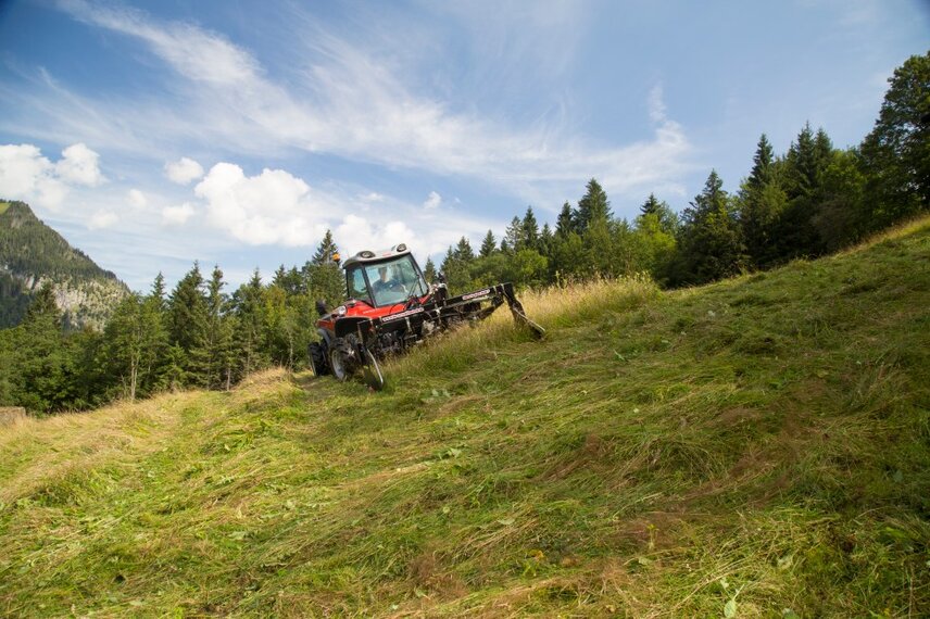The cultivation and maintenance of an ecological area confronts farmers with especially high challenges. These meadows are not only valuable for ecological reasons but also landscape wise and are therefore subject to strict rules concerning the first cut or the type of mowers being used as examples. A perfect combination for this demanding task is the Aebi Terratrac with double-blade mower. This mower is, due to its design, significantly lighter compared to rotary-blade mowers and also the Aebi TT211 convinces with its low weight. Therefore, the impact on the soil can be reduced considerably. Rotary Blade Mowers cut the food via quick-rotating blades. The double-blade mowers cut the plants via scissor-type cuts. This results in a perfectly straight cut that improves significantly the regrow-conditions of the plants. By using a double-blade mower the food is equally deposited on the field. The outcome of this: Excellent drying characteristics and significant reduction of subsequent turnover operations. Furthermore, is the food pollution reduced considerably by using a double-blade mower due to the fact that contamination, e.g. from molehills, is not spread across the food.