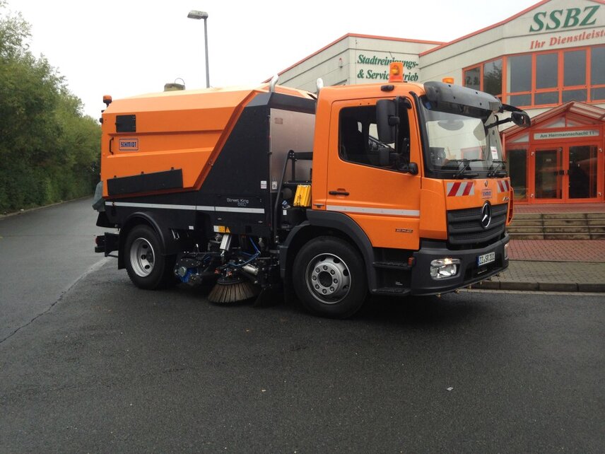 In May the mounted sweeper Street King 660 of Schmidt was firstly presented at IFAT in Munich. Now in mid of October the first two machines have been delivered in Germany. From now on the two powerful sweepers will be cleaning the streets of the cathedral city Zeitz, operated by SSBZ “Stadtreinigungs- und Servicebetrieb Zeitz GmbH”. Elmar Wilms, responsible for product presentations, was in charge of the instruction of the new machine. Mr. Hermann of the SSBZ is an experienced Schmidt sweeper driver. A Schmidt SK650 with interchangeable body modules is already in use since 16 years for the winter service in Zeitz. Nevertheless the Street King 660 is waiting with some novelties to be discovered.