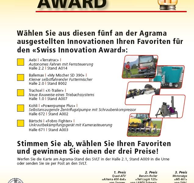 The Aebi Terratrac with Autonom option is nominated for the Swiss Innovation Award of the Swiss Agricultural Technology magazine. Take part and vote now. The deadline for entries is 30.11.2016. There are great prizes to be won, including a quad ATV "Alterra 400 4×4" from Snopex worth CHF 8390.