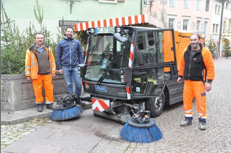 The small machine, which has now been presented to the press by the head of the construction depot Reiner Jehle together with the two drivers, comes on a road network of a total of 60 kilometers, mainly in the pedestrian zones in Waldshut and Tiengen, on sidewalks and cycle paths, as well as on all kinds of public roads Areas such as station forecourt, parking lots or underpasses are used.
