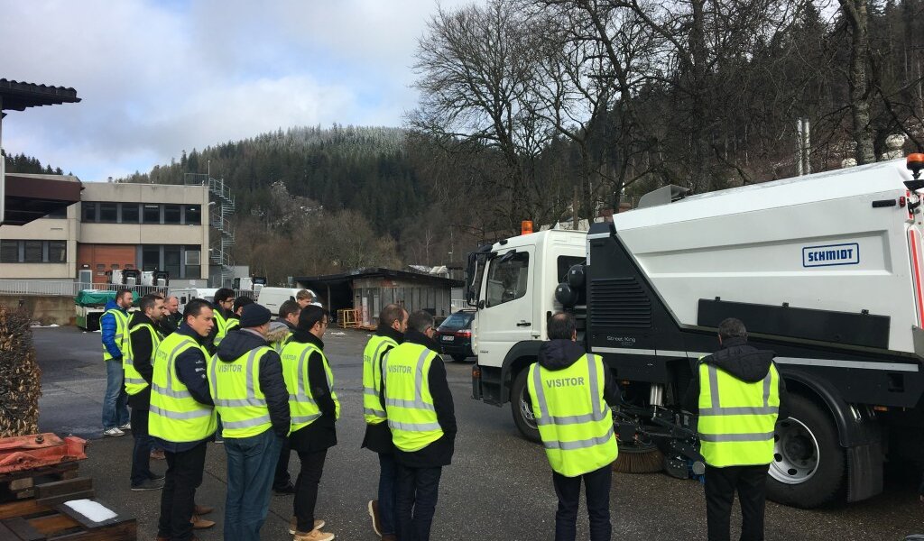 Beginning of March, 14 representatives of different municipalities of France and our dealer Europe Service were able to take a glance behind the curtains of the production at Schmidt in St. Blasien. The representatives came from cities such as Nice, Metz, Strasbourg or St. Nazaire. On the “journey” through the different stations of the production from logistics to the assembly to the final inspection the guests were able to inform themselves about the production of Schmidt sweepers at first hand. Especially the modern Swingo production line was well received. Nearly three years ago it was completely renewed and redesigned following the innovative Lean Management approach. This contained the optimisation of various processes to increase productivity – for the benefit of quality and delivery times. With this Schmidt sets new standards in the production of sweepers and is able to respond more quickly and flexible to fluctuating numbers of units and different customer requirements.