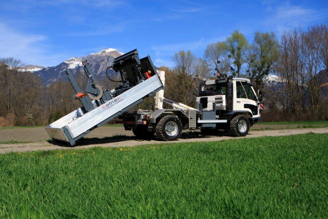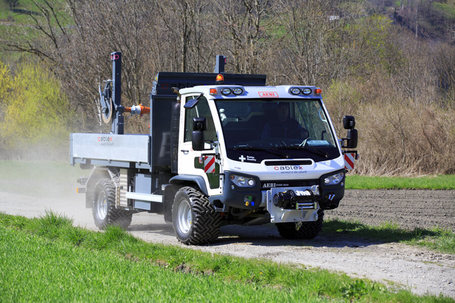 cablex is linking together the future of communication, energy and transport. The company ensures, by planning, constructing and maintaining telecommunications networks for Swisscom, for example, that Switzerland remains interconnected. As part of this work, the cables must often be transported over many kilometres to their intended destination – and this is not always easy to get to. The work often takes place on cramped construction sites or on rough or steep terrain, which makes it a real logistical challenge. A flexible, powerful solution that could be used off-road was therefore called for: the Aebi VT450 Vario transporter with a corresponding mountable attachment for a wide range of different applications.