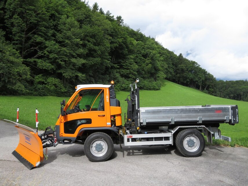 In addition, the multifunctional transporter has a hook and a dumper, which allows up to 5 tonnes of load. This dual function offers a versatile use of the vehicle beyond the winter service, whether this means road maintenance, forestry work or on construction sites, transporting excavated material. Due to the excellent off-road capability, off-road driving in steep mountain slopes is no problem, as the Aebi VT450 Vario demonstrated during a test ride impressively.