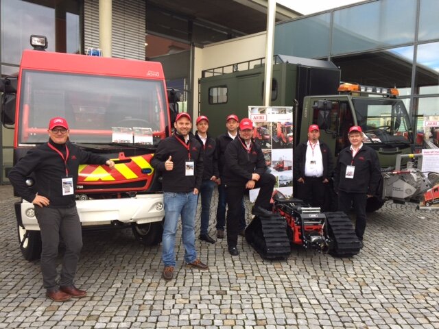"There is great interest, the first day was already a complete success," said Charles Bonè, Sales Manager at Aebi Schmidt Germany, after the first day of the fair. “The special thing about our vehicles is the design and the flexibility in terms of body,” explains Charles Bonè. “With a width of just 1.70 meters, the Aebi MT750 is not only extremely compact, but also offers many plus points with its 4 × 4 drive, a 156 hp Euro 6 turbo diesel and a cabin with up to 6 seats. The construction is carried out individually according to customer requirements. There are no limits to the TLF, LF, KLF, equipment trolleys, ambulance or box bodies. A front cable winch or the conversion according to special safety regulations, e.g. for the military, are no problem. The Aebi VT450 Vario, also a 4 × 4 transporter from the factory in Burgdorf, is even available with a crawler chassis on request, so that even in winter the approach to particularly snowy and impassable terrain is secured. "