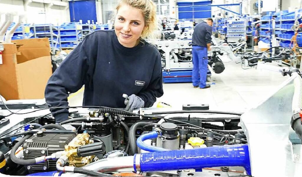 Technical knowledge is crucial, says Lorena Zipfel, and training supervisor Andreas Stoll adds: "I don't see any difference between a man and a woman in this job." The workplace is ergonomically designed, no one has to lift heavy things. The heaviest work step is probably pushing the vehicles to the next assembly station, says Lorena Zipfel with a smile.
