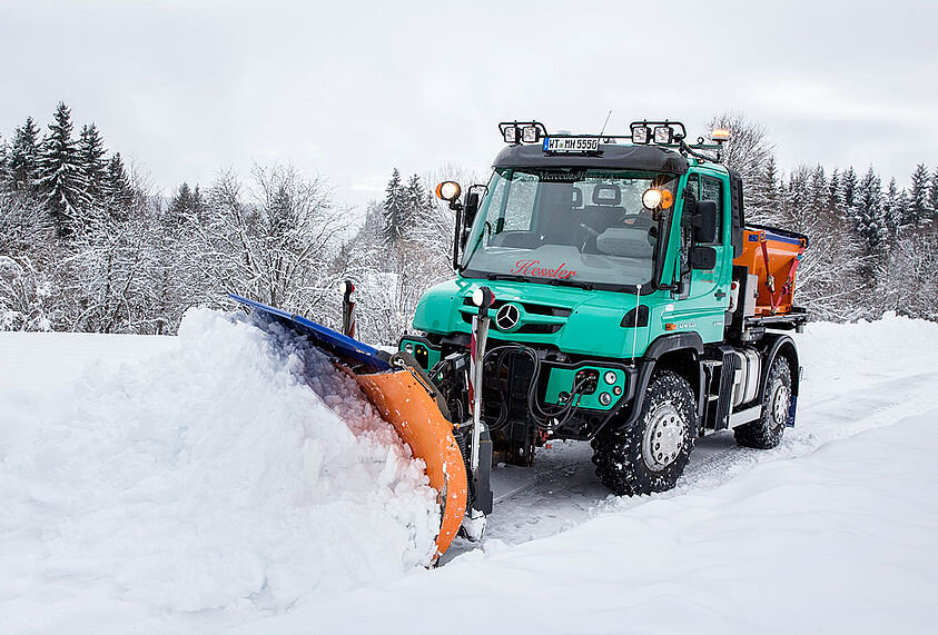 During the cold season, the night always ends early for Markus Kessler and his father Helmut. Because already at four o'clock it goes into the company's own hall. The new Unimog U 427 with Schmidt snow plow and spreader is already waiting there. Since 1959, the men from Kessler Holztransporte have been clearing the streets of the community of Häuser in winter - now in the seventh generation. For this purpose, Unimog are used in the family business without exception. Because only the all-rounders from Mercedes-Benz combine reliability and maneuverability with a high level of driving comfort. And not just in winter.