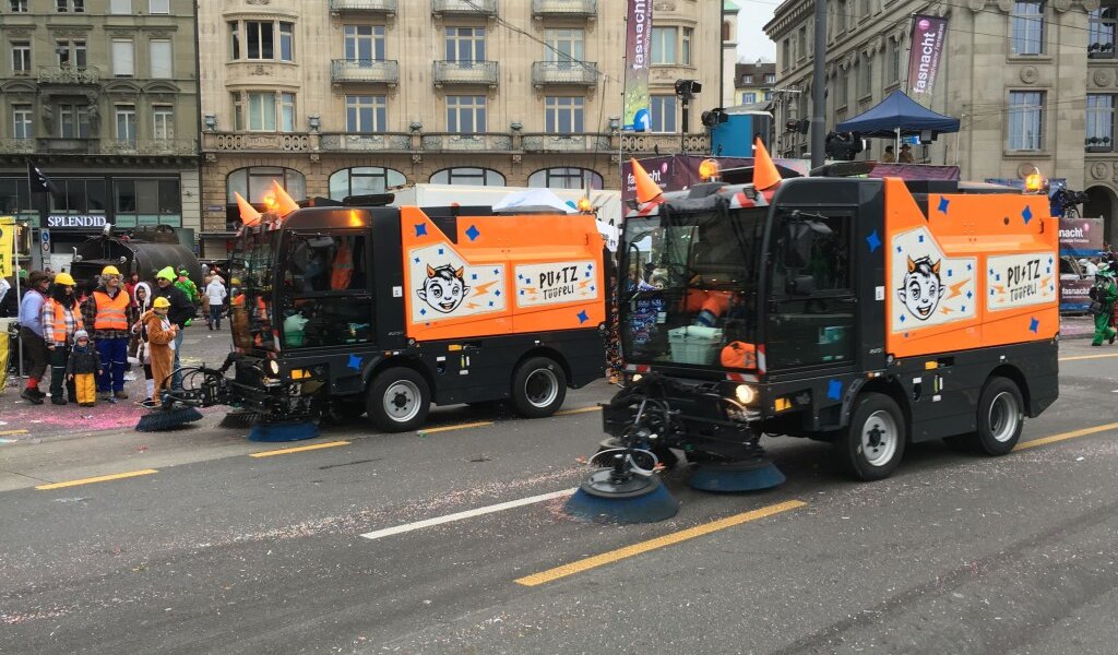 Carnival in Lucerne is a one-of-a-kind spectacle. The historical town on the banks of Lake Lucerne transforms into a bubbling cauldron of jesters and clowns. As one of the largest Carnival events in Switzerland, the annual festival welcomes up to 40,000 visitors to the narrow alleys of the old town. It’s the time to shine for the ‘Putzüüfeli’ (‘little cleaning beasts’), as the sweepers here are affectionately called. Together with four other sweepers from the Swingo series, these two monsters in the 4 m3 class from Aebi Schmidt took the rear of the parades on Fat Thursday and Carnival Monday. Up to 110 tonnes of refuse and confetti were sucked up by the machines over the five days of Carnival.