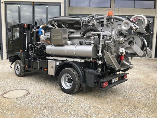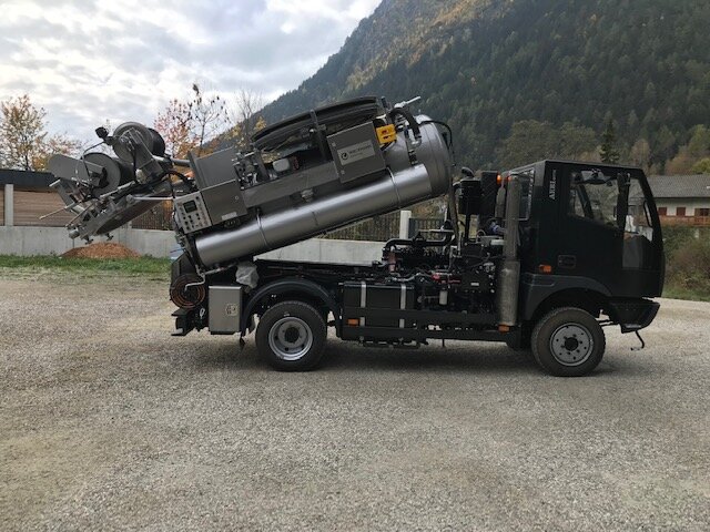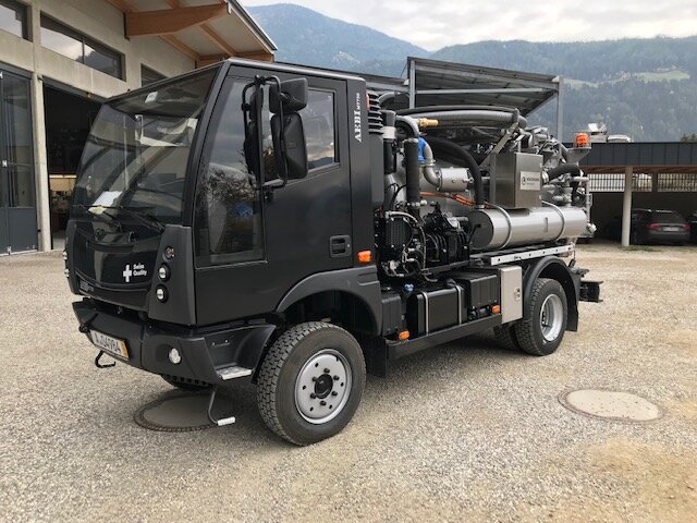 Not only its paintwork is unusual, the structure of Wiedemann enviro tec Germany is also a custom-made product. The black Aebi MT750 is used by the community of Gais Bruneck in the South Tyrolean mountains and in narrow inner city areas for sewer cleaning. The 1.70m slim implement carrier with a permissible total weight of 7.5 tons is also ready for use in rough terrain thanks to its all-wheel drive. A strong turbo diesel engine with 156PS brings a lot of power to the road. The cabin can accommodate up to 3 people.