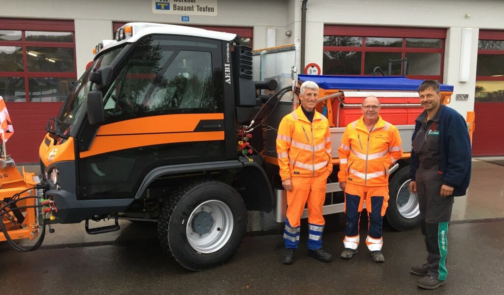 The first snowflakes are only a blink of an eye away. The municipality of Teufen in the canton of Appenzell Ausserrohden (CH) was able to receive a new Aebi VT450 Vario in good time before ice and snow take over the streets. Equipped with the latest Euro 6c engine generation and powerful 109 hp, the all-wheel drive vehicle is used in the 6,300 community in both summer and winter. Factory manager Kurt Keller and his six employees are looking forward to working with their new colleague. In winter it is important to ensure safe conditions on 17 km of roads and 23 km of sidewalks in the municipality. There are more than 500 meters of altitude to be overcome, as the operational area extends from 680 to 1100 meters above sea level. In the summer season, the vehicle is used with a removable rear crane for transport and municipal tasks of all kinds. With a permissible total weight of 9.5 tonnes, there are (almost) no limits here, as the VT450 Vario with a payload of 4.2 tonnes is a real load carrier.
