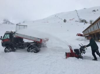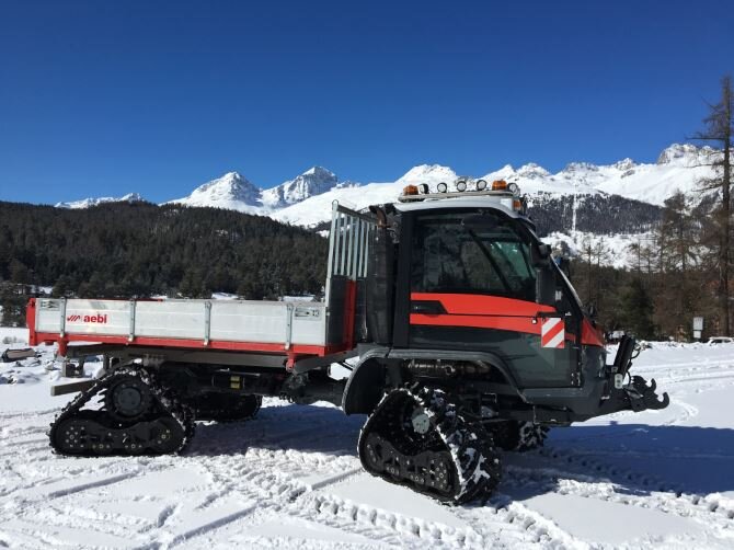 A good preparation of ski slopes, tracks and environment is essential to meet the needs of professionals as well as amateur athletes in ski areas like St. Moritz in Switzerland. Our Aebi VT 450 Vario Euro 6C with crawler tracks convinced the municipal team of St. Moritz during a test last week. The special profile of the caterpillars ensures a very smooth running and due to the large contact surface, the ground pressure drops significantly, which in turn protects the terrain and increases climbing ability. And even if the winter is  coming to an end, the transporter runs also in summer service. Converted from caterpillars to wheels in only some hours, the Aebi VT 450 Vario Euro 6C also shows its effectiveness in summer and can be used for transports as well as for working with a rear crane or supplying the local gastronomy.