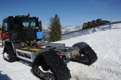 Like the conventional model, the eVT 450 Vario is a four-wheel drive vehicle with a stepless power-split hydrostatic-mechanical transmission and can be easily switched from tires to a crawler track and back as needed. The large surface area of the crawler track in particular minimizes the vehicle’s impact on the terrain — an advantage over tractors which is especially clear when the Transporter is used on ski slopes and snow-covered roads. The eVT 450 Vario’s useful load of up to 5 tonnes is unparalleled in the electric Transporter class. The vehicle can also be quickly fitted with a flatbed or a closed body depending on what is being transported.