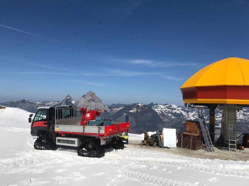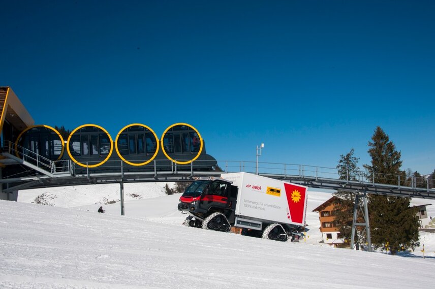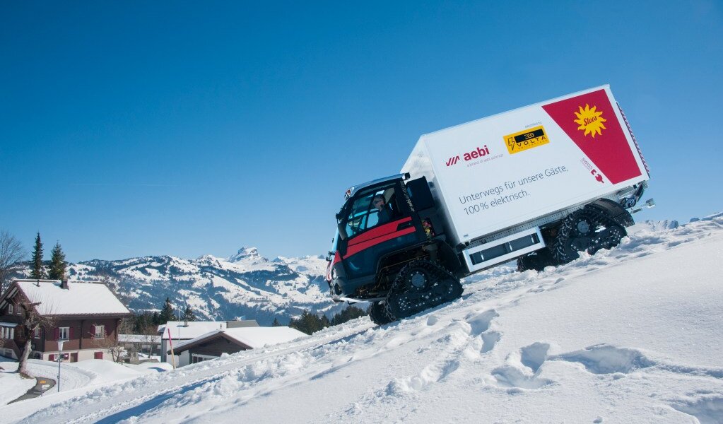 Stoos/Schwyz, April 17, 2019 — At 1,305 meters above sea level in the car-free Swiss village of Stoos, the future is underway. All eyes were on the village when the world’s steepest funicular was opened there in December 2017, and now it is the venue of another small world premiere with great potential, as Aebi celebrates the first Aebi Transporter fitted with a fully electric drive.