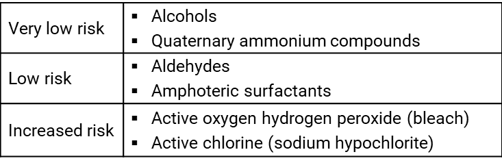 Depending on the concentration, basically all the above-mentioned components can be used. Usually the tanks in the machines are made of plastic, but in some cases also of aluminium, stainless steel or steel. However, in any case the tanks must be completely and sufficiently rinsed with fresh water after each operation, at the latest after the completed day shift. In addition, virucides and biocides may require further action or precaution according the advise or regulation of the disinfectant manufacturer.