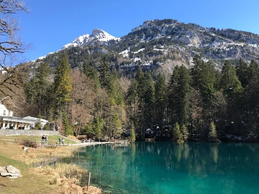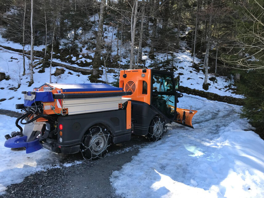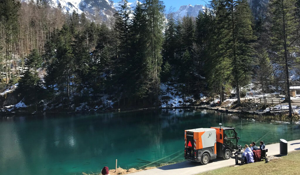 In winter, equipped with a snow plough, snow broom and split spreader, the Flexigo 150 reliably clears the narrow and steep paths around lake Blausee of snow and ice thanks to its high engine output of 75 hp and energy-efficient permanent all-wheel drive and ensures that they are used safely.