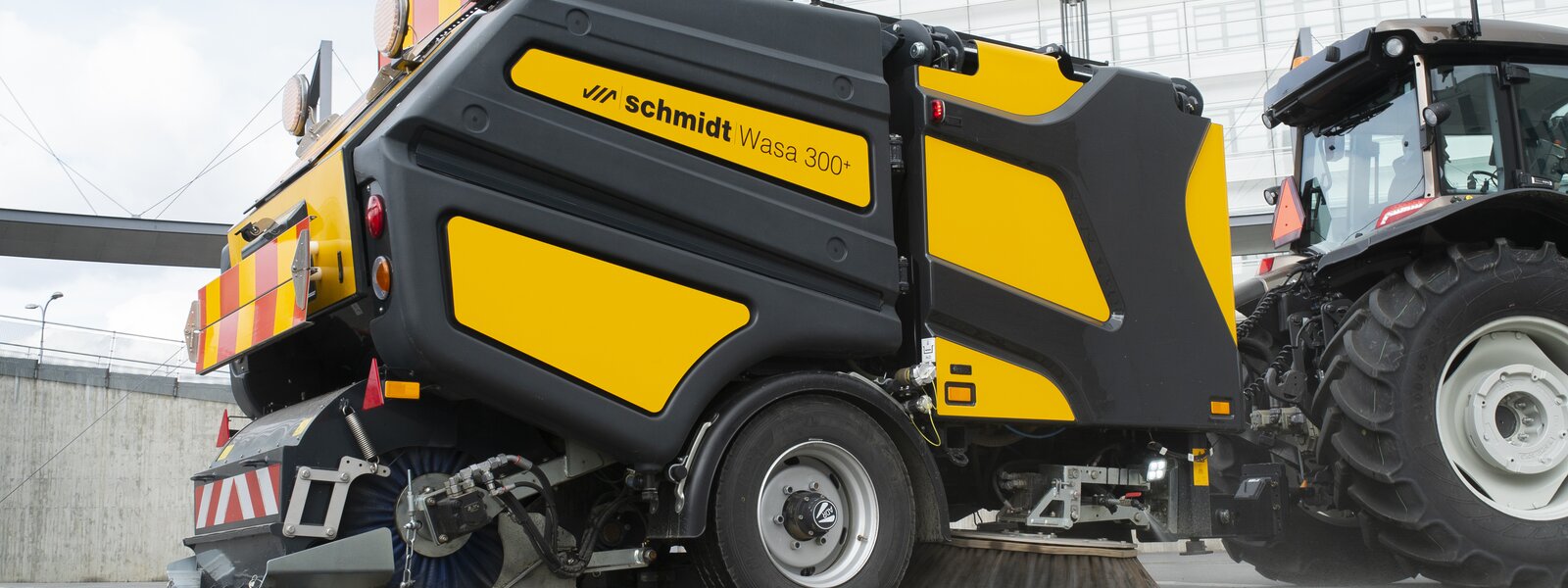 The Wasa 300+ is also highly efficient: it produces outstanding, high-precision sweeping performance – not least due to the 12 water spray nozzles on the sweeper unit, which are supplied by a hydraulic water pump with up to 36 l/min from the plastic water tanks on the left and right with 1,100 l of storage capacity.
