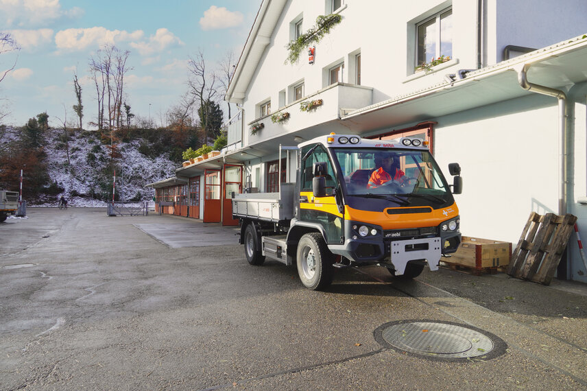 So how does the Aebi eVT 450 prototype perform? “We’re already hoping that we’ll be able to replace several vehicles with the eVT 450 in the future due to its versatile application potential in both summer and winter,” Georg Brechbühl continues. “The great thing about the eVT is that it’s a municipal vehicle that can also be used off-road.” The eVT 450 was supplied fully equipped for town use – with a snow plough and grit spreader for the winter and a three-way tipper and crane for the summer. So far, everything has been as good as the conventional diesel VT 450. However, the biggest sticking point before making the commitment to changing over to electric vehicles is the battery life. “These vehicles have to work hardest during winter, when we’re out in snowstorms with ploughs and salt spreaders,” says Jonas Lüdi. “This is when the vehicle is subjected to the highest demands and so the demands on the battery are correspondingly high. The battery must have a capacity equivalent to 75 litres of diesel in order to be able to complete the entire winter route.” The vehicle is not yet able to do this. Our developers are thus eagerly awaiting the snow. To gain a better understanding of the performance requirements, for the next phase we have fitted a device that can precisely record the energy consumption. This will provide valuable insights for further development. “What is really exciting about the eVT 450 is the acceleration, which is considerably better than before,” explains Jonas Lüdi. “The upkeep is also more cost-effective – servicing so far has cost us around half that of diesel vehicles, and vehicle checks are also a lot faster.”