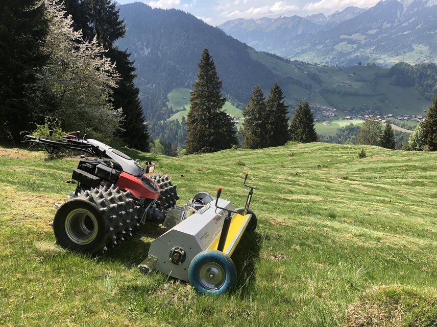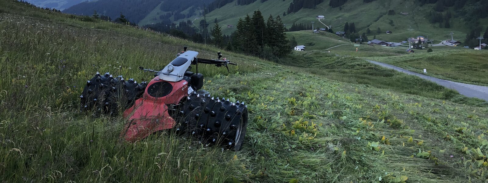 Single-axle machines are increasingly being preferred to tractor mowers in mountain farming as their very low weight means that they can be used for earlier cutting in periods of good weather and they also help to protect the turf. Soil compaction is increasingly becoming an issue in mountain farming too and many young farmers are keen to work in a way that protects the soil. With its clever leasing model, Stefan Gempeler’s machine fleet is bringing machinery to an entire valley in a more efficient and gentle way – with a bit of knowledge and creativity and two Aebi CCs.