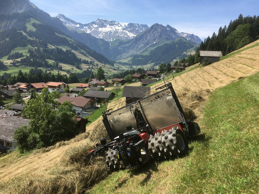 What does a child who has grown up in the mountains and has a love of machines do when they grow up? The logical choice is to train to become a mechanic for agricultural machines while establishing yourself as a mountain farmer – then you will have the best of both worlds. Stefan Gempeler learned everything there is to know about working with and servicing agricultural machines from his local Aebi dealer in the village of Adelboden in Switzerland. He has since also started the process of taking over his uncle’s farm together with his cousin, meaning that he now performs the combined roles of farmer, machine designer and farm machinery contractor. As farmers, they run a farm with an area of just under 20 hectares, with twelve dairy cows and breeding in mountain zone 3. This is a three-level farm with valley farming, pasture and alpine areas. There are lots of these types of farms in Switzerland, and they all face the same question of which equipment they should buy themselves and which not.