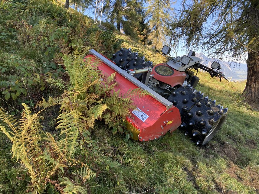 The CC 110, on the other hand, is mainly used in conjunction with a 1.90-m mowing bar for mowing on extremely steep terrain. However, there is not so much of this that each farmer can afford to have their own implement carrier for it. “Generally everyone tries to do as much mowing as possible with the large motor mower or even the two-axle mower, or the tractor mower, because the mowing width on these is much bigger. We don’t have many really steep areas in our region. But that is exactly why people often come too late rather than too early to borrow the CC 110 for extreme terrain,” he explains. Because on steep terrain the situation can suddenly become dangerous from one moment to the next. “I am particularly grateful for the drive selector lever in these situations, but mainly also the hydrostatic drive and the hydraulic steering system,” he says. “Often I pay more attention to the attachment in those situations than I do to the vehicle. And it is extremely pleasant if you no longer have to wrench the columns as you did in the past.”